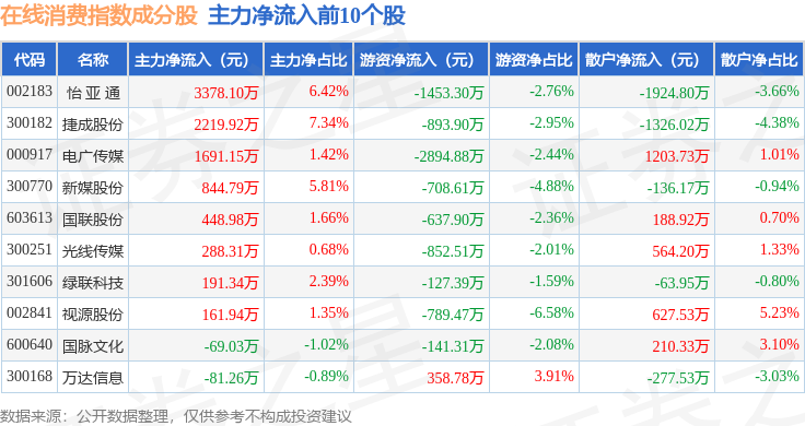 资金流向方面,在线消费(399361)指数成份股当日主力资金净流出合计17.38亿元,游资资金净流入合计2.77亿元,散户资金净流入合计14.6亿元。成份股资金流向详情见下表: