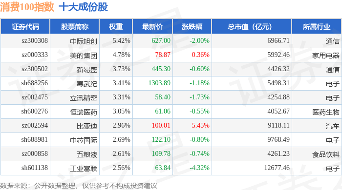证券之星消息,12月26日,消费100(399364)指数报收于10863.9点,跌0.42%,成交2050.62亿元,换手率1.14%。当日该指数成份股中,上涨的有34家,比亚迪以5.45%的涨幅领涨,下跌的有63家,新诺威以6.77%的跌幅领跌。