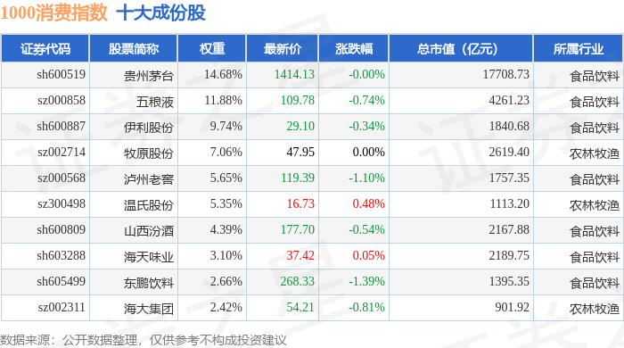 证券之星消息,12月26日,1000消费(399385)指数报收于9455.67点,跌0.41%,成交219.32亿元,换手率1.52%。当日该指数成份股中,上涨的有18家,万辰集团以1.64%的涨幅领涨,下跌的有32家,新诺威以6.77%的跌幅领跌。