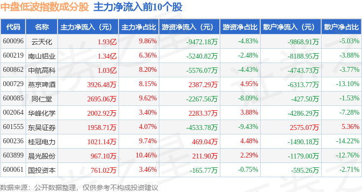 资金流向方面,中盘低波(399406)指数成份股当日主力资金净流出合计11.52亿元,游资资金净流出合计2.29亿元,散户资金净流入合计13.81亿元。成份股资金流向详情见下表:
