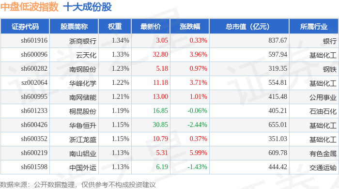 证券之星消息,12月26日,中盘低波(399406)指数报收于13654.63点,涨0.3%,成交359.7亿元,换手率0.86%。当日该指数成份股中,上涨的有49家,西部矿业以6.06%的涨幅领涨,下跌的有41家,华鲁恒升以2.44%的跌幅领跌。