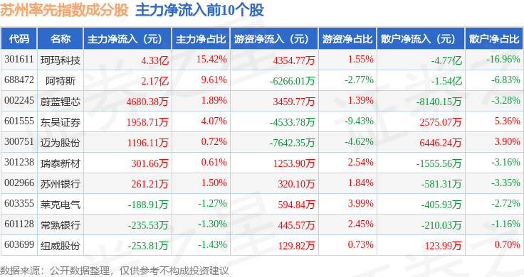资金流向方面,苏州率先(399410)指数成份股当日主力资金净流出合计11.55亿元,游资资金净流入合计4.2亿元,散户资金净流入合计7.34亿元。成份股资金流向详情见下表: