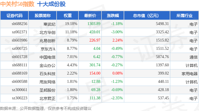 证券之星消息,12月26日,中关村50(399423)指数报收于3018.3点,跌0.3%,成交559.86亿元,换手率1.17%。当日该指数成份股中,上涨的有26家,北斗星通以9.99%的涨幅领涨,下跌的有23家,北方华创以3.0%的跌幅领跌。
