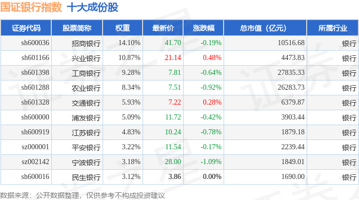 证券之星消息,12月26日,国证银行(399431)指数报收于7917.24点,跌0.36%,成交161.52亿元,换手率0.15%。当日该指数成份股中,上涨的有4家,兴业银行以0.48%的涨幅领涨,下跌的有24家,渝农商行以1.25%的跌幅领跌。