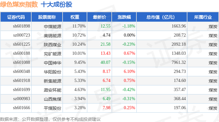 证券之星消息,12月26日,绿色煤炭(399436)指数报收于3827.89点,涨0.28%,成交49.59亿元,换手率0.61%。当日该指数成份股中,上涨的有13家,华阳股份以6.1%的涨幅领涨,下跌的有7家,中煤能源以1.18%的跌幅领跌。