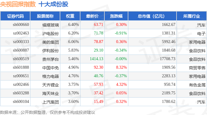 证券之星消息,12月26日,央视回报(399553)指数报收于7780.7点,涨0.83%,成交541.88亿元,换手率1.28%。当日该指数成份股中,上涨的有22家,中国中免以8.32%的涨幅领涨,下跌的有26家,环旭电子以2.42%的跌幅领跌。