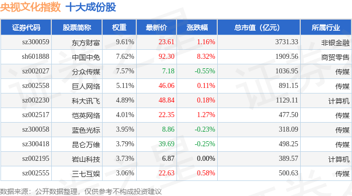 证券之星消息,12月26日,央视文化(399557)指数报收于1909.02点,涨0.82%,成交415.14亿元,换手率2.1%。当日该指数成份股中,上涨的有24家,中国中免以8.32%的涨幅领涨,下跌的有22家,华侨城A以2.32%的跌幅领跌。