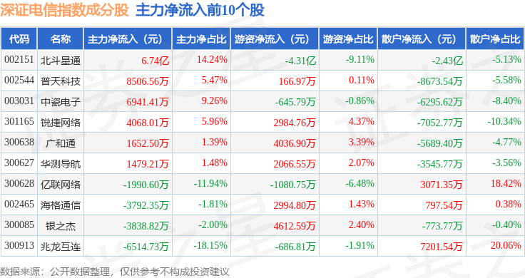 资金流向方面,深证电信(399621)指数成份股当日主力资金净流出合计45.47亿元,游资资金净流入合计27.15亿元,散户资金净流入合计18.32亿元。成份股资金流向详情见下表: