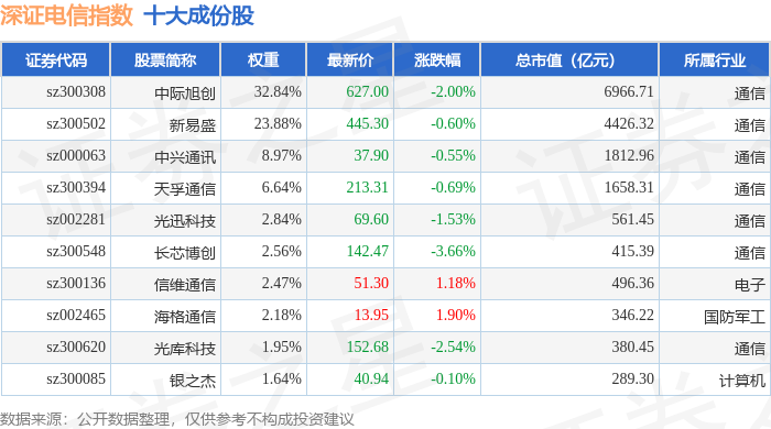 深证电信(399621)指数十大成份股详情如下: