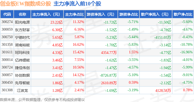 资金流向方面,创业板EW(399635)指数成份股当日主力资金净流出合计40.31亿元,游资资金净流入合计13.5亿元,散户资金净流入合计26.81亿元。成份股资金流向详情见下表:
