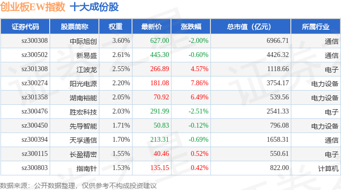创业板EW(399635)指数十大成份股详情如下: