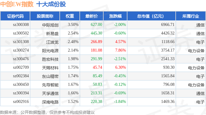 证券之星消息,12月26日,中创EW(399660)指数报收于2773.11点,涨0.16%,成交2275.21亿元,换手率1.54%。当日该指数成份股中,上涨的有47家,阳光电源以7.86%的涨幅领涨,下跌的有50家,新诺威以6.77%的跌幅领跌。