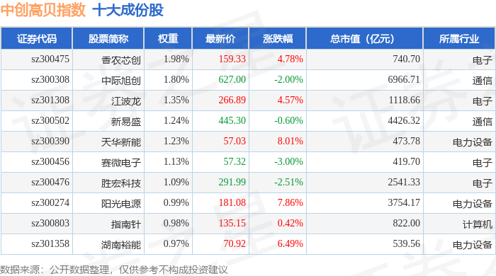 证券之星消息,12月26日,中创高贝(399666)指数报收于2065.35点,跌0.2%,成交3331.85亿元,换手率3.95%。当日该指数成份股中,上涨的有74家,星源材质以8.87%的涨幅领涨,下跌的有124家,罗博特科以6.38%的跌幅领跌。