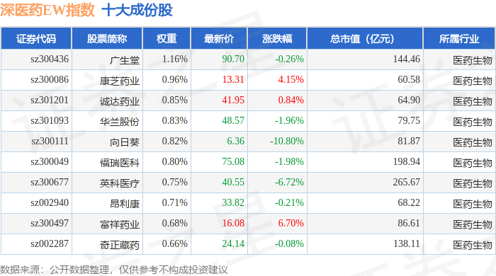 证券之星消息,12月26日,深医药EW(399676)指数报收于3783.07点,跌0.37%,成交421.86亿元,换手率2.06%。当日该指数成份股中,上涨的有48家,宏源药业以20.0%的涨幅领涨,下跌的有167家,向日葵以10.8%的跌幅领跌。