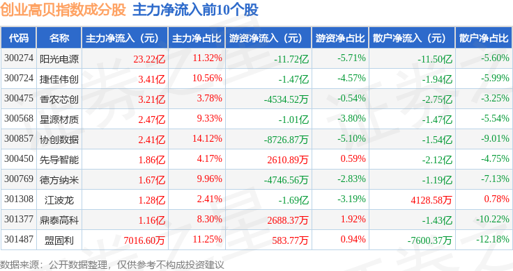 资金流向方面,创业高贝(399694)指数成份股当日主力资金净流出合计53.9亿元,游资资金净流入合计22.01亿元,散户资金净流入合计31.89亿元。成份股资金流向详情见下表:
