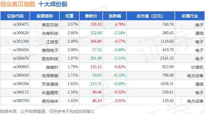 证券之星消息,12月26日,创业高贝(399694)指数报收于4336.71点,跌0.09%,成交1806.73亿元,换手率4.37%。当日该指数成份股中,上涨的有40家,星源材质以8.87%的涨幅领涨,下跌的有59家,联特科技以5.04%的跌幅领跌。