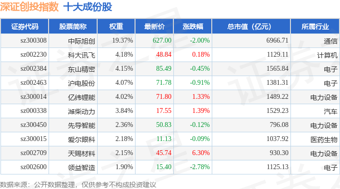 深证创投(399696)指数十大成份股详情如下: