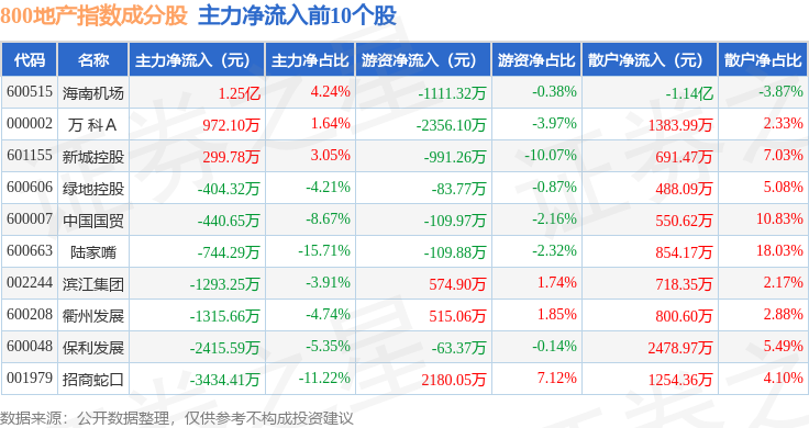 资金流向方面,800地产(399965)指数成份股当日主力资金净流出合计744.26万元,游资资金净流出合计749.96万元,散户资金净流入合计1494.22万元。成份股资金流向详情见下表: