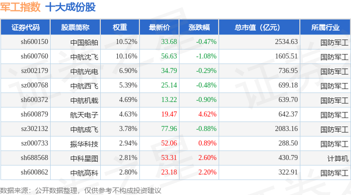 资金流向方面,军工指数(399959)成份股当日主力资金净流出合计34.84亿元,游资资金净流入合计6.58亿元,散户资金净流入合计28.26亿元。成份股资金流向详情见下表: