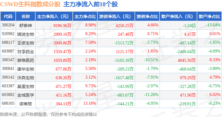 资金流向方面,CSWD生科(399993)指数成份股当日主力资金净流出合计4.95亿元,游资资金净流入合计8518.43万元,散户资金净流入合计4.36亿元。成份股资金流向详情见下表: