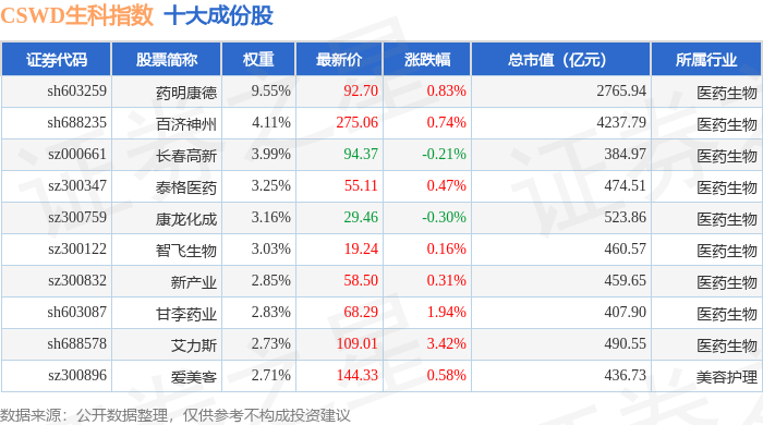 证券之星消息,12月26日,CSWD生科(399993)指数报收于2660.41点,涨0.1%,成交140.31亿元,换手率0.97%。当日该指数成份股中,上涨的有29家,艾力斯以3.42%的涨幅领涨,下跌的有70家,首药控股以4.13%的跌幅领跌。