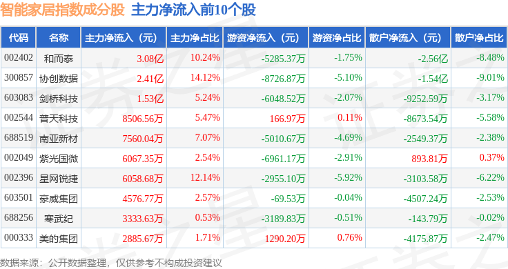 资金流向方面,智能家居(399996)指数成份股当日主力资金净流出合计83.38亿元,游资资金净流入合计19.63亿元,散户资金净流入合计63.75亿元。成份股资金流向详情见下表: