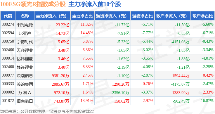 资金流向方面,100ESG领先R(470030)指数成份股当日主力资金净流入合计2.03亿元,游资资金净流出合计9.77亿元,散户资金净流入合计7.74亿元。成份股资金流向详情见下表: