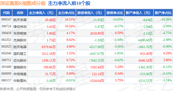 资金流向方面,深证高装R(470037)指数成份股当日主力资金净流入合计4.21亿元,游资资金净流出合计15.02亿元,散户资金净流入合计10.82亿元。成份股资金流向详情见下表: