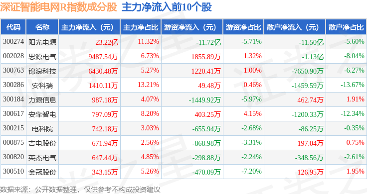 资金流向方面,深证智能电网R(470054)指数成份股当日主力资金净流入合计13.27亿元,游资资金净流出合计11.56亿元,散户资金净流出合计1.71亿元。成份股资金流向详情见下表: