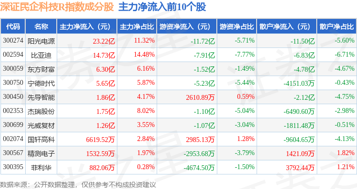 资金流向方面,深证民企科技R(470059)指数成份股当日主力资金净流入合计29.04亿元,游资资金净流出合计27.0亿元,散户资金净流出合计2.03亿元。成份股资金流向详情见下表: