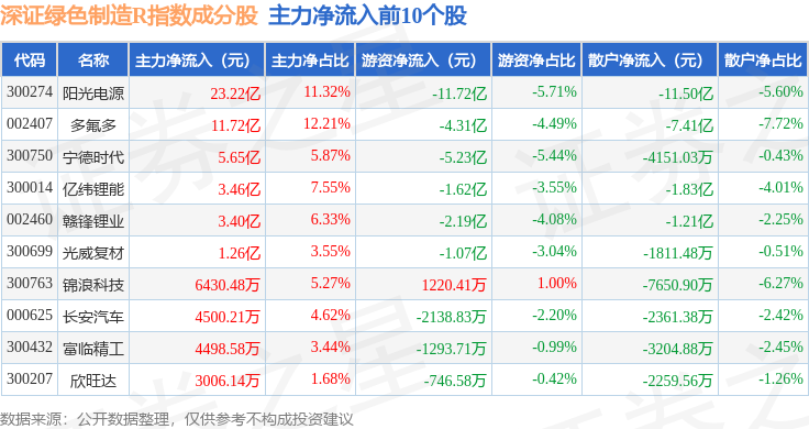 资金流向方面,深证绿色制造R(470069)指数成份股当日主力资金净流出合计10.98亿元,游资资金净流出合计10.04亿元,散户资金净流入合计21.02亿元。成份股资金流向详情见下表: