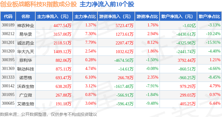 资金流向方面,创业板战略科技R(471004)指数成份股当日主力资金净流出合计30.88亿元,游资资金净流入合计4.21亿元,散户资金净流入合计26.67亿元。成份股资金流向详情见下表: