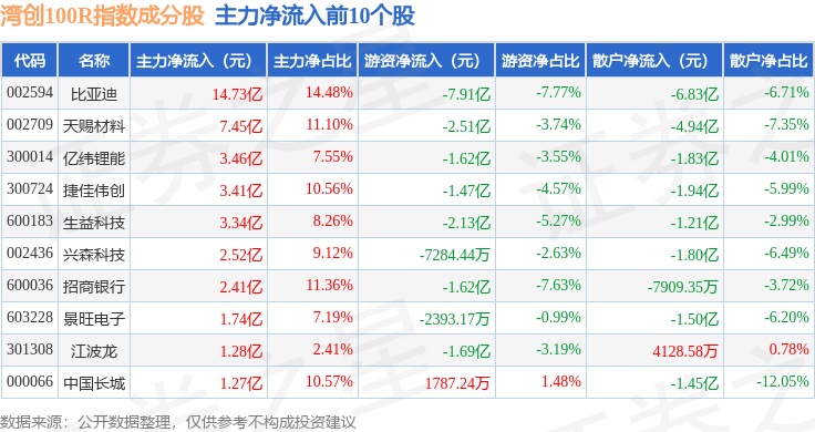 资金流向方面,湾创100R(480001)指数成份股当日主力资金净流出合计27.72亿元,游资资金净流出合计2.62亿元,散户资金净流入合计30.35亿元。成份股资金流向详情见下表: