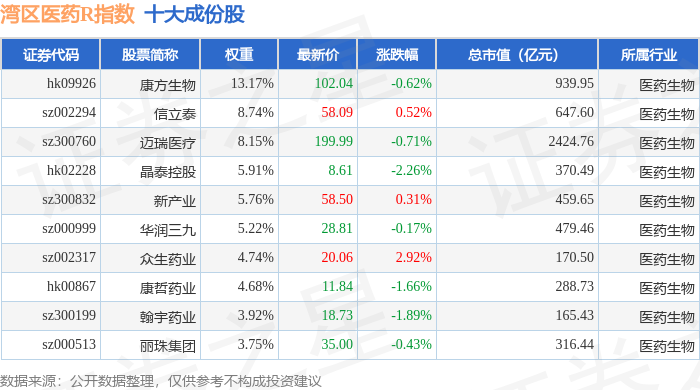 资金流向方面,湾区医药R(480013)指数成份股当日主力资金净流出合计1.61亿元,游资资金净流入合计6290.4万元,散户资金净流入合计9832.97万元。成份股资金流向详情见下表:
