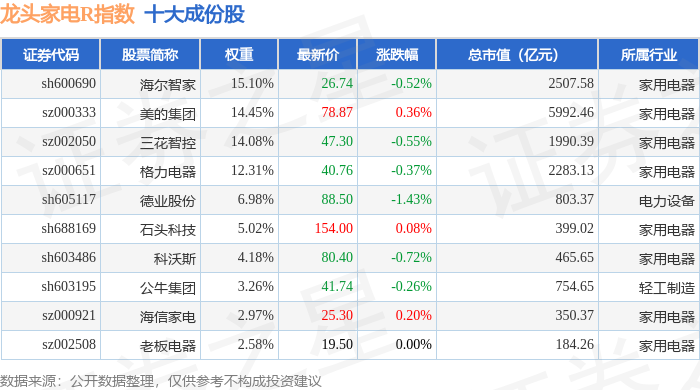 龙头家电R(480028)指数十大成份股详情如下: