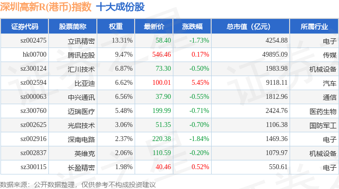 深圳高新R(港币)(480039)指数十大成份股详情如下: