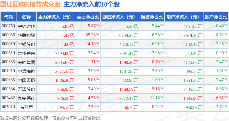 资金流向方面,国证回购R(480063)指数成份股当日主力资金净流入合计2.16亿元,游资资金净流出合计5.35亿元,散户资金净流入合计3.17亿元。成份股资金流向详情见下表: