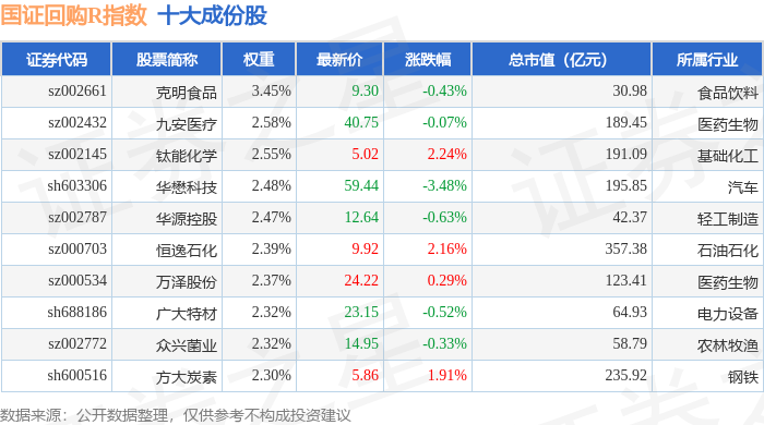 证券之星消息,12月26日,国证回购R(480063)指数报收于4026.27点,涨0.03%,成交330.73亿元,换手率0.84%。当日该指数成份股中,上涨的有22家,华联控股以10.0%的涨幅领涨,下跌的有25家,华懋科技以3.48%的跌幅领跌。