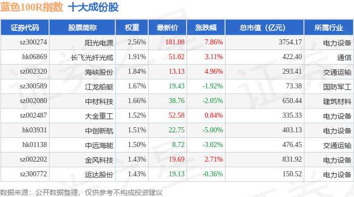证券之星消息,12月26日,蓝色100R(480068)指数报收于4770.05点,涨0.43%,成交685.92亿元,换手率3.42%。当日该指数成份股中,上涨的有42家,胜通能源以10.01%的涨幅领涨,下跌的有53家,中创新航以5.0%的跌幅领跌。