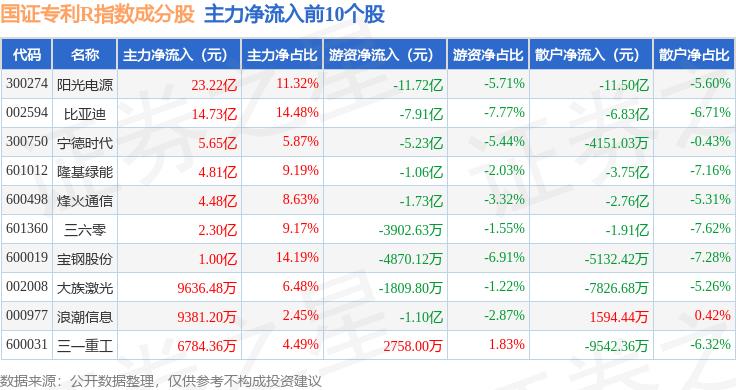资金流向方面,国证专利R(480070)指数成份股当日主力资金净流出合计9.11亿元,游资资金净流出合计8.98亿元,散户资金净流入合计18.09亿元。成份股资金流向详情见下表:
