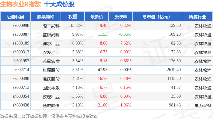 生物农业R(480072)指数十大成份股详情如下: