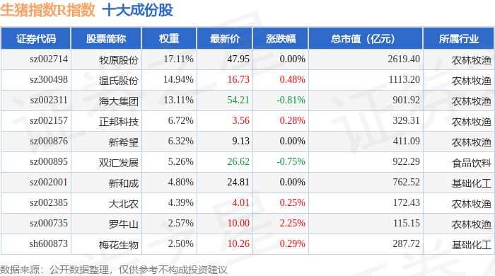 证券之星消息,12月26日,生猪指数R(480073)指数报收于3543.79点,跌0.03%,成交87.4亿元,换手率1.48%。当日该指数成份股中,上涨的有14家,罗牛山以2.25%的涨幅领涨,下跌的有23家,生物股份以2.17%的跌幅领跌。