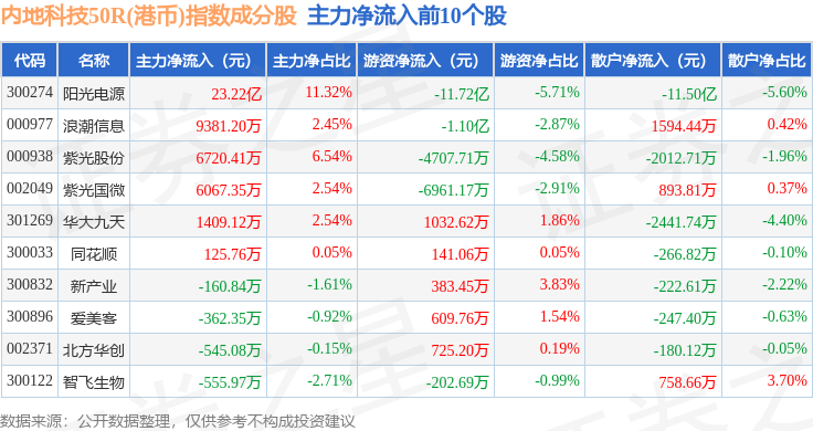 资金流向方面,内地科技50R(港币)(483004)指数成份股当日主力资金净流出合计1.21亿元,游资资金净流出合计8.23亿元,散户资金净流入合计9.44亿元。成份股资金流向详情见下表: