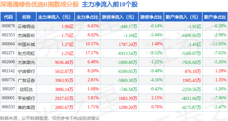 资金流向方面,深港通绿色优选R(483011)指数成份股当日主力资金净流出合计19.37亿元,游资资金净流入合计4.91亿元,散户资金净流入合计14.46亿元。成份股资金流向详情见下表: