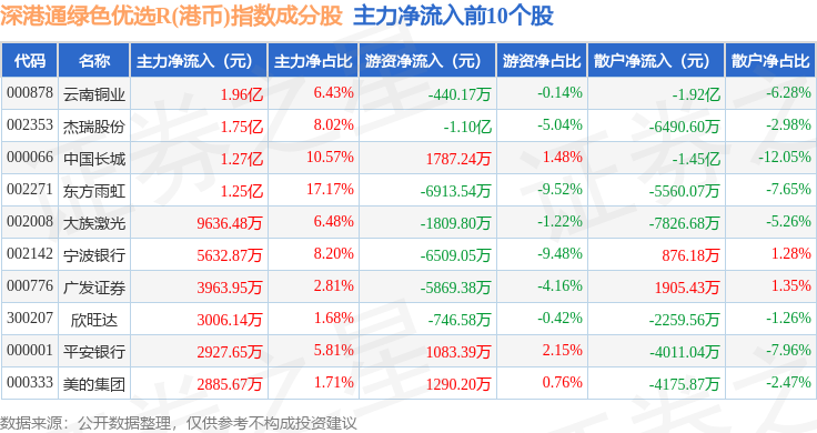 资金流向方面,深港通绿色优选R(港币)(483012)指数成份股当日主力资金净流出合计19.37亿元,游资资金净流入合计4.91亿元,散户资金净流入合计14.46亿元。成份股资金流向详情见下表: