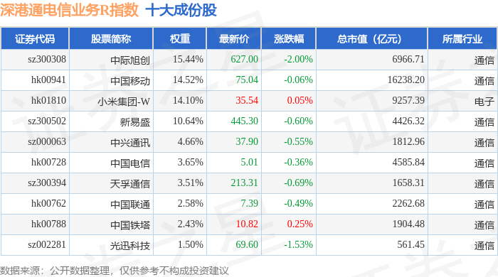 深港通电信业务R(483029)指数十大成份股详情如下: