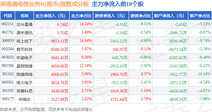 资金流向方面,深港通电信业务R(港币)(483030)指数成份股当日主力资金净流出合计51.96亿元,游资资金净流入合计26.36亿元,散户资金净流入合计25.61亿元。成份股资金流向详情见下表:
