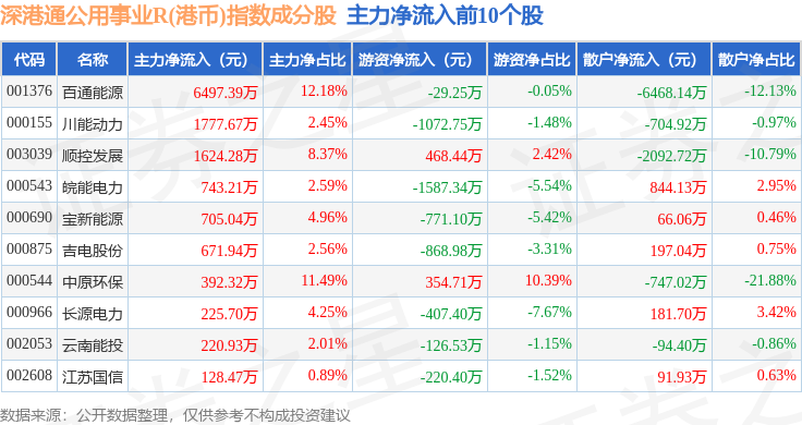 资金流向方面,深港通公用事业R(港币)(483032)指数成份股当日主力资金净流出合计1.59亿元,游资资金净流出合计1.04亿元,散户资金净流入合计2.63亿元。成份股资金流向详情见下表: