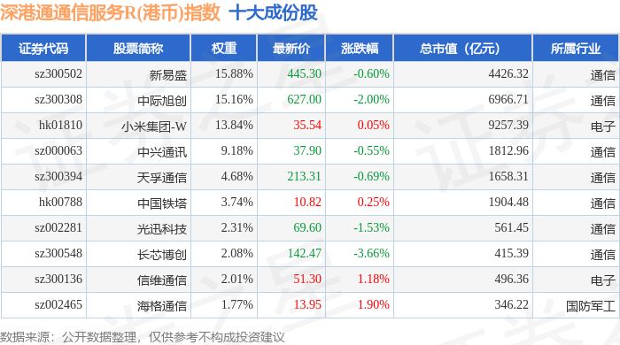 深港通通信服务R(港币)(483034)指数十大成份股详情如下: