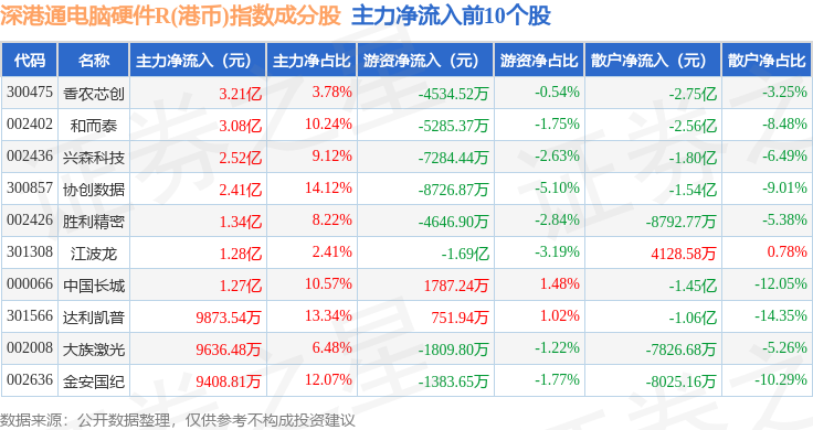 资金流向方面,深港通电脑硬件R(港币)(483044)指数成份股当日主力资金净流出合计55.13亿元,游资资金净流入合计2.95亿元,散户资金净流入合计52.18亿元。成份股资金流向详情见下表: